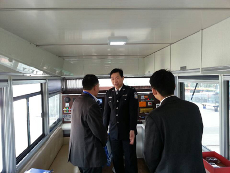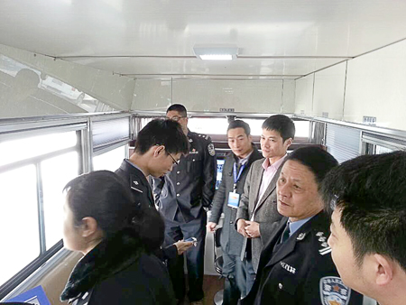 工作人員向江蘇公安領(lǐng)導(dǎo)介紹流動(dòng)警務(wù)室