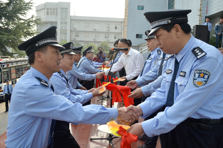 韓城市公安局領(lǐng)導(dǎo)為基層警務(wù)人員發(fā)放象征移動(dòng)警務(wù)室的“金鑰匙”