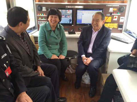 宿州市副市長趙琳在移動警務(wù)室上與孔總、馬總交談