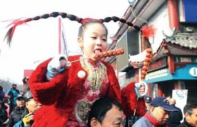 “小姑娘,吃一吃糖球,甜不甜。 ”這不是糖球攤位的叫賣者,而是攝影愛好者在尋找最佳的拍攝角度。和以往不同的是,這次節(jié)會上除了長辮子的劉依芃、王梓萱以外,還增加了兩個孩子王,都是騎在爺爺、爸爸的肩膀上,面對攝影愛好者的“長槍短炮”,各個都不怯場,當(dāng)了一回糖球會小明星代言人,搶足了鏡頭。劉依芃的媽媽王瑋特意買了兩個高家糖球,讓她坐在姥爺?shù)募珙^盡情地吃。