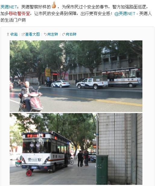 新浪網(wǎng)微博:英德NET:英德警察好樣的,[贊]為保市民過個安全的春節(jié),警方加強路面巡邏,加多電動移動警務(wù)室,讓市民的安全得到保障,出行更有安全感!@英德NET - 英德人的生活門戶網(wǎng)