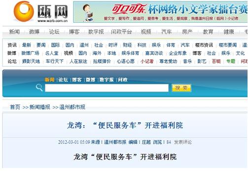 無(wú)意間看到這則新聞時(shí)的心情是難以言喻的: 11年9月23日龍灣區(qū)公安分局警務(wù)室發(fā)車(chē)儀式的場(chǎng)景此時(shí)還歷歷在目,至今這臺(tái)警務(wù)室已經(jīng)快半歲了,卻已化身為“辦證便民服務(wù)車(chē)”開(kāi)進(jìn)福利院為需要社會(huì)關(guān)懷的孤寡老人服務(wù)。