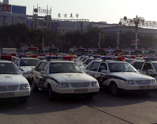 整齊的警務(wù)人員及身后的警務(wù)車輛